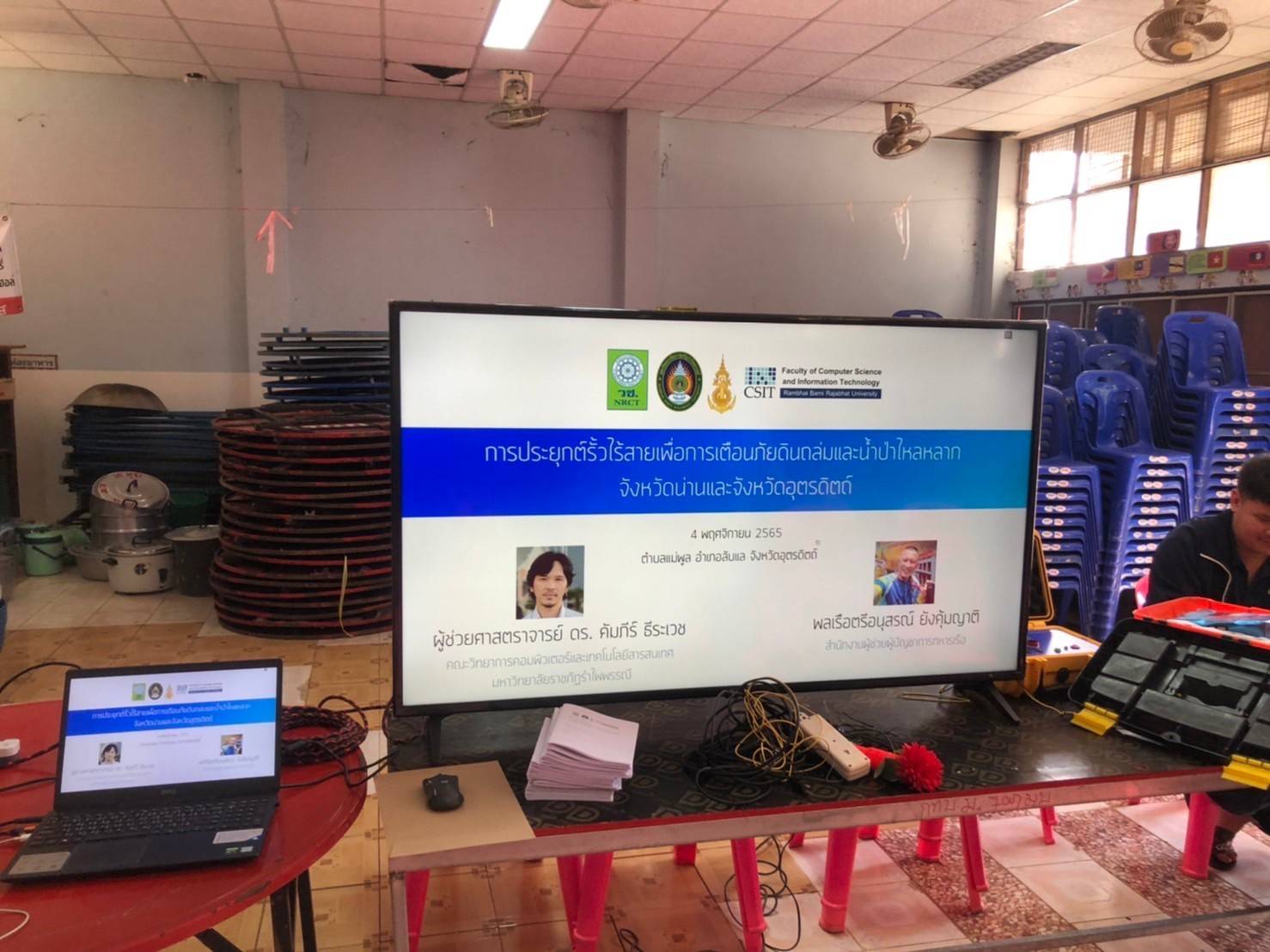 ผู้ช่วยศาตราจารย์ปฏิคม ทองจริง คณบดีคณะวิทยาการคอมพิวเตอร์และเทคโนโลยีสารสนเทศ ร่วมเดินทางกับคณะผู้วิจัย นำทีมโดยผู้ช่วยศาสตราจารย์ ดร. คัมภีร์ ธีระเวช อาจารย์ประจำสาขาวิชาภูมิสารสนเทศ คณะวิทยาการคอมพิวเตอร์และเทคโนโลยีสารสนเทศ มหาวิทยาลัยราชภัฏรำไพพรรณี และ พลเรือตรีอนุสรณ์ ยังคุ้มญาติ จากสำนักงานผู้ช่วยผู้บัญชาการทหารเรือ ในการอบรมเชิงปฏิบัติการเพื่อถ่ายทอดองค์ความรู้การใช้งานและการบำรุงรักษาอุปกรณ์ โครงการวิจัย เรื่อง การประยุกต์รั้วไร้สายเพื่อการเตือนภัยดินถล่มและน้ำป่าไหลหลาก จังหวัดน่านและจังหวัดอุตรดิตถ์ ในวันศุกร์ที่ 4 พฤศจิกายน พ.ศ. 2565 ณ ศูนย์พัฒนาเด็กเล็กโรงเรียนบ้านห้วยใต้ ตำบลแม่พูล อำเภอลับแล จังหวัดอุตรดิตถ์ และ คณะเทคโนโลยีอุตสาหกรรม มหาวิทยาลัยราชภัฏอุตรดิตถ์